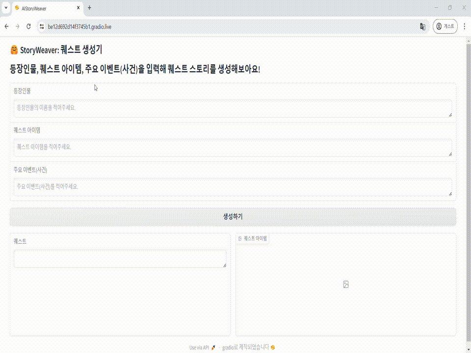 Gradio๋ Gradio ๊ณต์ ๋ฌธ์๋ฅผ ์ฐธ๊ณ ํ์ฌ ๋ง๋ค์์ต๋๋ค.
