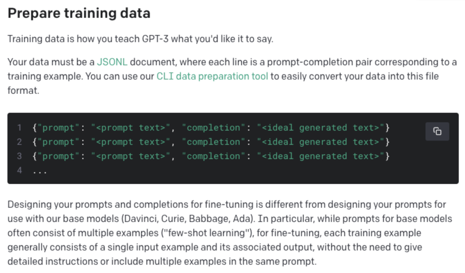 ํ์ต์ ์งํํ๊ธฐ ์ํด์๋ ๋ฐ์ดํฐ ํฌ๋งท์ ์ค์ ํด์ค์ผ ํฉ๋๋ค. OpenAI์ Fine-tuning ๊ณต์ Document๋ฅผ ๋ณด๋ฉด ์๋ ์ฌ์ง๊ณผ ๊ฐ์ด ์ค๋ช